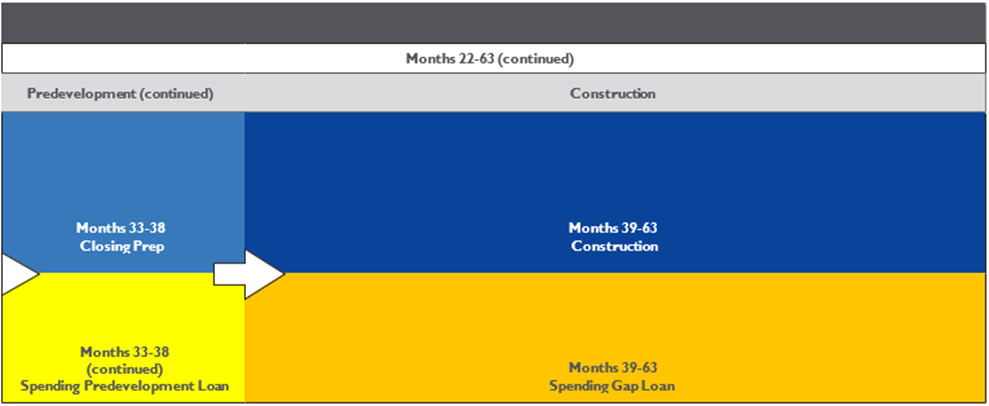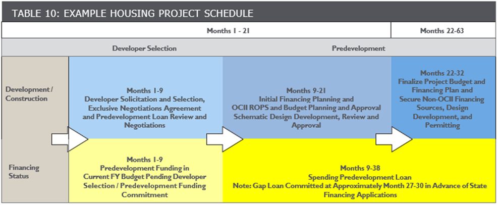 The blue-shaded areas show predevelopment and construction activities and the yellow-shaded areas show the status of OCII financing during the same period. OCII typically approves funding for predevelopment once the development team solicitation is complete and then a larger permanent funding amount (the “gap” amount) later, once the project specifics are finalized.