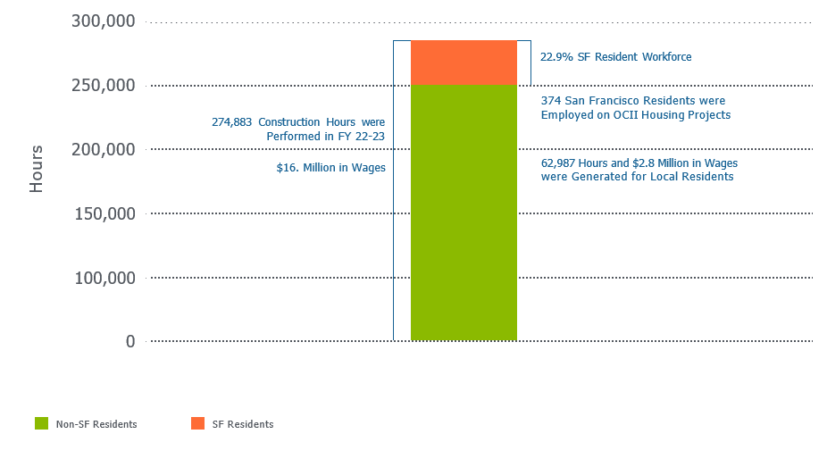 On OCII-sponsored affordable and inclusionary housing projects in FY 22-23, OCII’s Local Construction Workforce Hiring Program created 2,498 construction jobs, of which 374 were filled by San Francisco residents, yielding an overall local workforce participation rate of 22.9%, as measured by work hours. In addition, the figures represent 62,987 hours of work performed by San Francisco residents and $2.9 million in wages paid to local residents (See Chart 2).