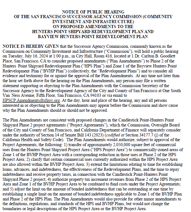 2024 Hunters Point Shipyard and Bayview Hunters Point Redevelopment Plan Amendment Notice