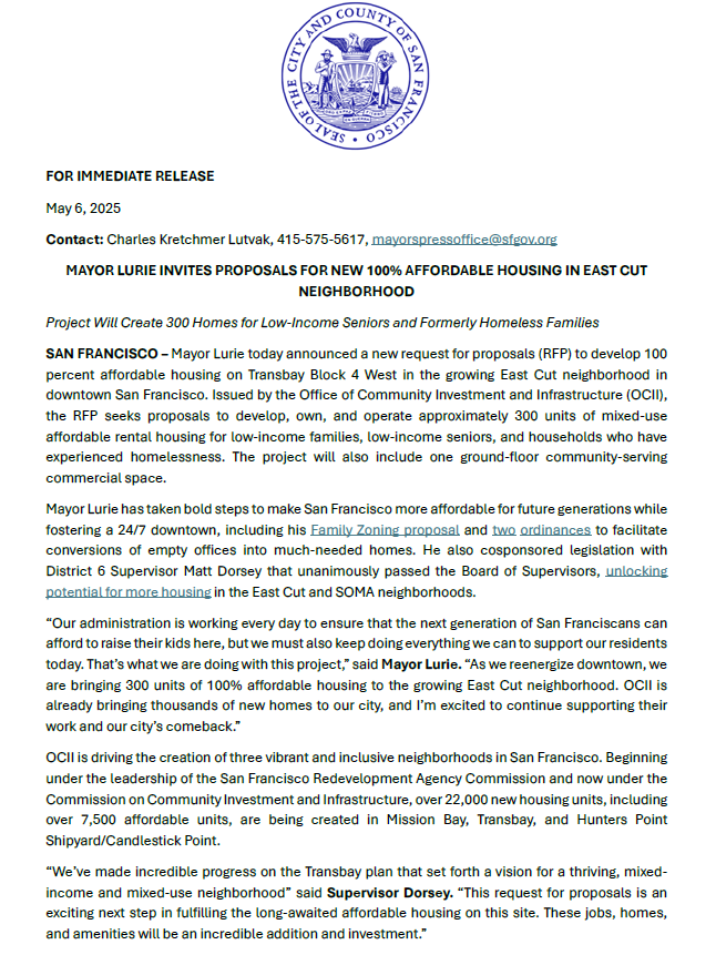 Mayor Lurie announced a new request for proposals (RFP) to develop 100 percent affordable housing on Transbay Block 4 West in the growing East Cut neighborhood in downtown San Francisco.